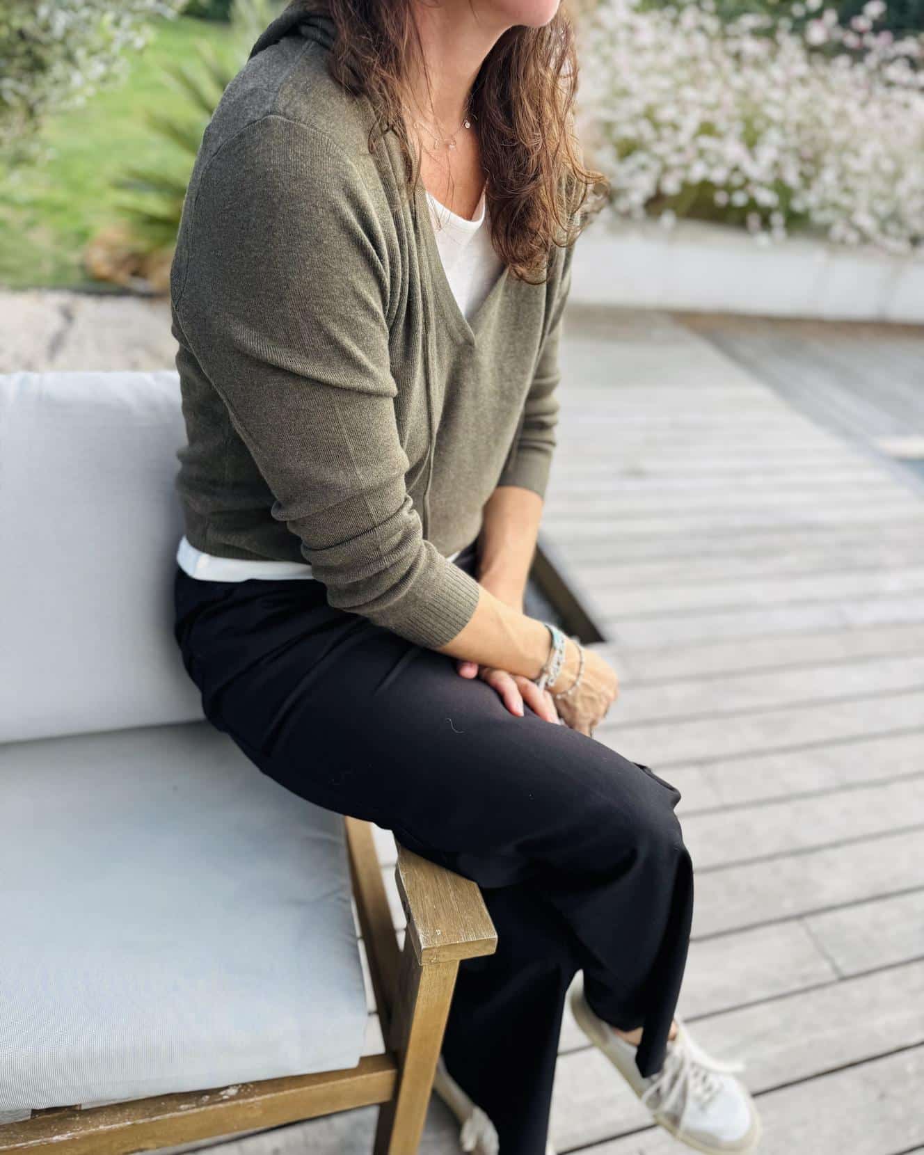 – pull fin kaki col V à manches longues et capuche ,la coupe est droite